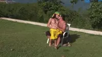 The sun was shining brightly as a sensual scene unfolded under the clear blue sky, providing an idyllic setting for the erotic escapades about to take place.In this outdoor haven, a sultry brunette named Sunny, sporting an alluring mix of skimpy bikini and a vibrant yellow sundress, was the center of attention.Her shimmering eyes, full lips, and prominent cleavage were drawing in the eyes of two muscular men, clad only in their boxer briefs, eager to please her and satiate her insatiable desire for sexual pleasure.As Sunny began her exploration into the wild world of carnal delights, she wasted no time indulging her newfound companions in an unforgettable experience.The first man found himself enticed by Sunnys enchanting voice and supple touch as she fell to her knees and offered her mouth to him, creating a heavenly moment where he surrendered to her cocksucking skills, relishing the sensation of her lips wrapped tightly around his erect shaft.Not one to be left out, the second man eagerly watched and lusted after Sunny, as she moved to the next, demonstrating an unmatched expertise in oral pleasures.Her hands expertly played with his nuts while her lips teased and tantalized his rockhard member, eliciting a moan of pure delight from him.As the scene shifted indoors, Sunny took charge and wasted no time stripping out of her dress, leaving her in just a barelythere bikini bottom, showcasing her perfect ass as she strutted towards the bed where her two partners were waiting patiently for her commands.As her hands touched their taut bodies, she could feel the energy coursing through them, fueling an explosive passion that was only just beginning.In a playful display of dominance, Sunny guided the first mans mouth towards her perky, sunkissed breasts, the puckered nipples peeking out from underneath her thin fabric, as she simultaneously rode his face with vigor.Meanwhile, the other mans focus remained on the sensuality of the moment, eager to offer any assistance needed while he caressed Sunnys ample hips and the swell of her ass cheeks.Feeling the fervent desire building within her, Sunny moved fluidly to her next target, shifting to a position that allowed her to be in complete control.With an air of dominance, she began riding him vigorously while the first mans fingers danced skillfully upon her swollen clit and slick vulva, highlighting her sensitive labia and tender folds as they played with her womanhood.Sunnys erotic dance soon escalated as penetration became the focus of this sensual tale, with her juicy lips engulfing another throbbing member in a fervent blowjob while simultaneously riding the other man, the penetration proving to be every bit as arousing and exhilarating.Her moans intermingled with his grunts, the rhythmic crescendo building an intense energy that seemed to ignite the air around them.In a thrilling display of physical prowess, Sunny transitioned into a sultry sixtynine position, allowing her to pleasure both partners simultaneously in a stunning display of oral expertise.The first mans hands trailed down to caress and finger her, their connection deeply embedded in the fabric of their passionate encounter.As the heat of passion reached its fever pitch, Sunnys eyes met the gaze of her final partner.Her commanding smirk telegraphed an understanding it was time for a climactic finish.Sunny moved with urgency as she climbed aboard his member, her wet slit engulfing him whole.The other two men provided support to their lover as Sunny reached her glorious peak, her body trembling with the intensity of a powerful orgasm.With each pulse of her walls around the thrusting shaft and the muffled gasps of blissful release, the scene dissolved into an earthshattering crescendo of eroticism, leaving behind an air of euphoria and satisfaction as the sun finally dipped beneath the horizon, casting a golden hue on their satisfied bodies.